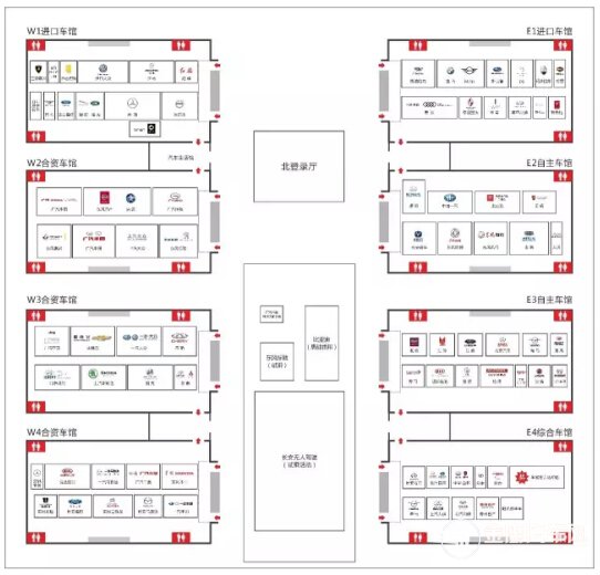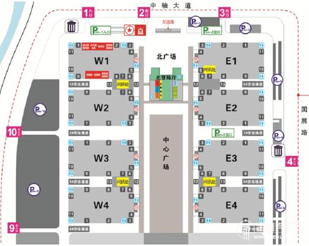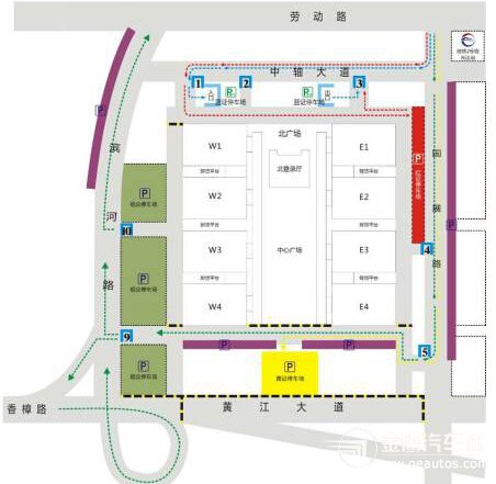 自驾 自己开车来的胖友们, 会展中心有小轿车停车位3200个, 大货车(大巴)停车位550个。 设有VIP、工作、普通车辆专属停车区, 下图墨绿色停车场区域为社会车辆停车场, 5号、9号、10号车辆进出口为社会车辆进出口。 请参照以下交通路线图指示找到自己停车的地方哦。  会展中心内配套设施全面, 由北登录厅进入展馆。 E1展馆、W1和W2展馆中间过道、W3和W4展馆中间过道、E3和E4展馆中间过道都设有问询台,如有任何问题可到问询台咨询工作人员。 中心内设有8个餐饮休闲区,逛累了的亲们可以到餐饮休闲区休息一下,继续看车~每一个展馆在各自展馆的四角设有卫生间,紧急情况不怕不怕哦!