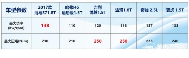 2017款海马S7全系搭配涡轮增压1.8T动力,其自主研发的1.8T发动机功率高达138kW,扭矩达230N?m,媲美合资车型2.4L动力水准,在同级竞品中具有明显的动力优势。 匹配6AM/6AT变速箱,辅以纯正SUV底盘,四轮独立悬挂系统,再配合其全新设计的大气阳刚造型及精准稳健的驾控调校,毫不夸张地说,2017款海马S7是中国SUV市场难得一见、驾乘俱佳的高水准SUV。