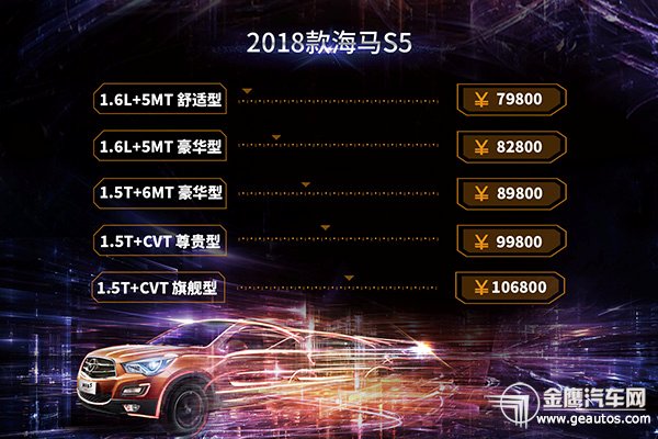 智能配置上,2018款海马S5的表现同样算得上可圈可点,配备了moofun移动互联人车生态系统、超清360°智能全景影像、高清8英寸触控大屏、手机智能互联系统、EPB+AutoHold、智能感应大灯、定速巡航等,为驾乘者提供安全的驾驶环境,满足了年轻消费层级的多样化需求。  三种动力总成 乐享无限驾趣 2018款海马S5涵盖1.6L+5MT、1.5T+6MT、1.5T+CVT三种动力总成,共5款车型,在提升产品综合性能的同时,谱系更加聚焦。