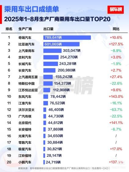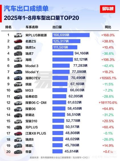 根据权威汽车媒体易车整理的出口数据:8月,比亚迪在生产厂商乘用车出口量排名中以79603辆的成绩位列第二,同比增长154.5%,增速排名第一。今年1-8月,比亚迪汽车累计出口量达601065辆,其中明星车型宋PLUS新能源销量达166699辆,摘得车型出口榜冠军,在国际市场的竞争力不断增加。