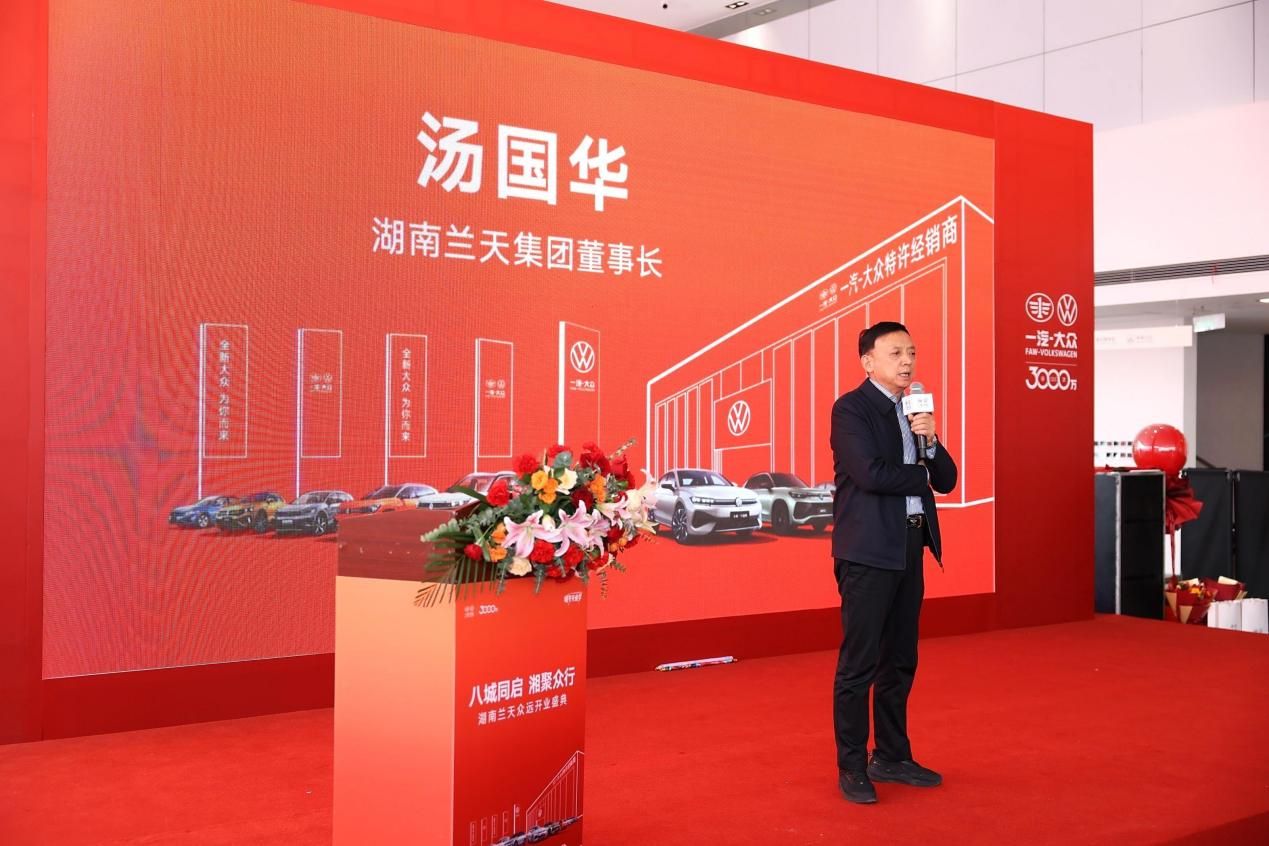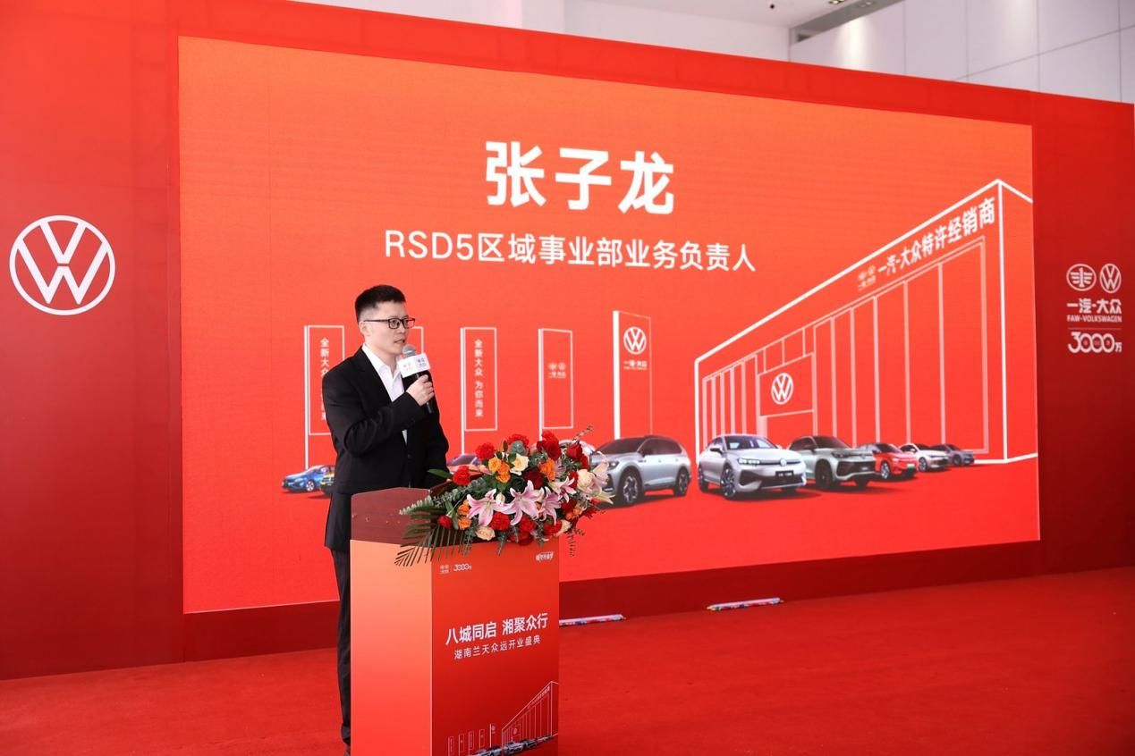 一汽-大众中南区区域事业部业务负责人张子龙发表致辞 同时,作为八店代表和大众品牌重要合作伙伴,兰天集团董事长汤国华先生发表致辞,表达了与品牌同行共赢的信心和决心,并将继续秉持匠心精神,通过透明化的购车流程、专业化的服务团队、贴心化的用车关怀,为车主打造全周期的优质服务体验,为湖南市场树立全新的服务标杆。