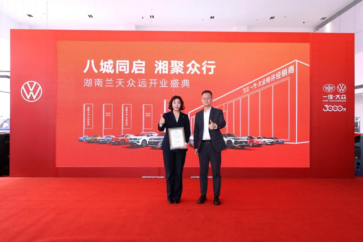 一汽-大众销售公司副总经理王小林为湖南兰天众远授牌 一汽-大众中南区区域事业部业务负责人张子龙在庆典上表示,“八城同启”的圆满收官,是大众品牌对一汽-大众3000万客户信赖的真挚回应,中南区以创新性的集中攻坚模式,实现了渠道建设速度与品质的双重突破,未来将持续推进网络升级,为客户提供更卓越的德系产品与服务体验。
