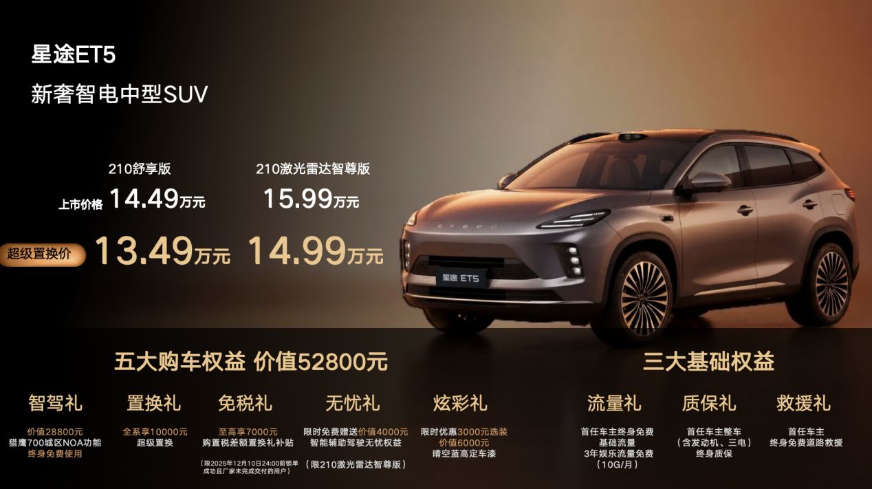 在万众期待的价格揭晓环节,星途 ET5 正式公布两款配置车型的官方指导价与专属权益:210 舒享版、210 激光雷达智尊版官方指导价 14.49 万元 - 15.99 万元,超级置换价低至 13.49 万元 - 14.99 万元,以满满诚意回馈中南地区消费者。更重磅的是,品牌宣布猎鹰 700 城区 NOA 功能终身免费使用,同时推出价值 52800 元的五大限时购车权益,部分权益限时尊享,为车展现场订车用户送上超值福利。