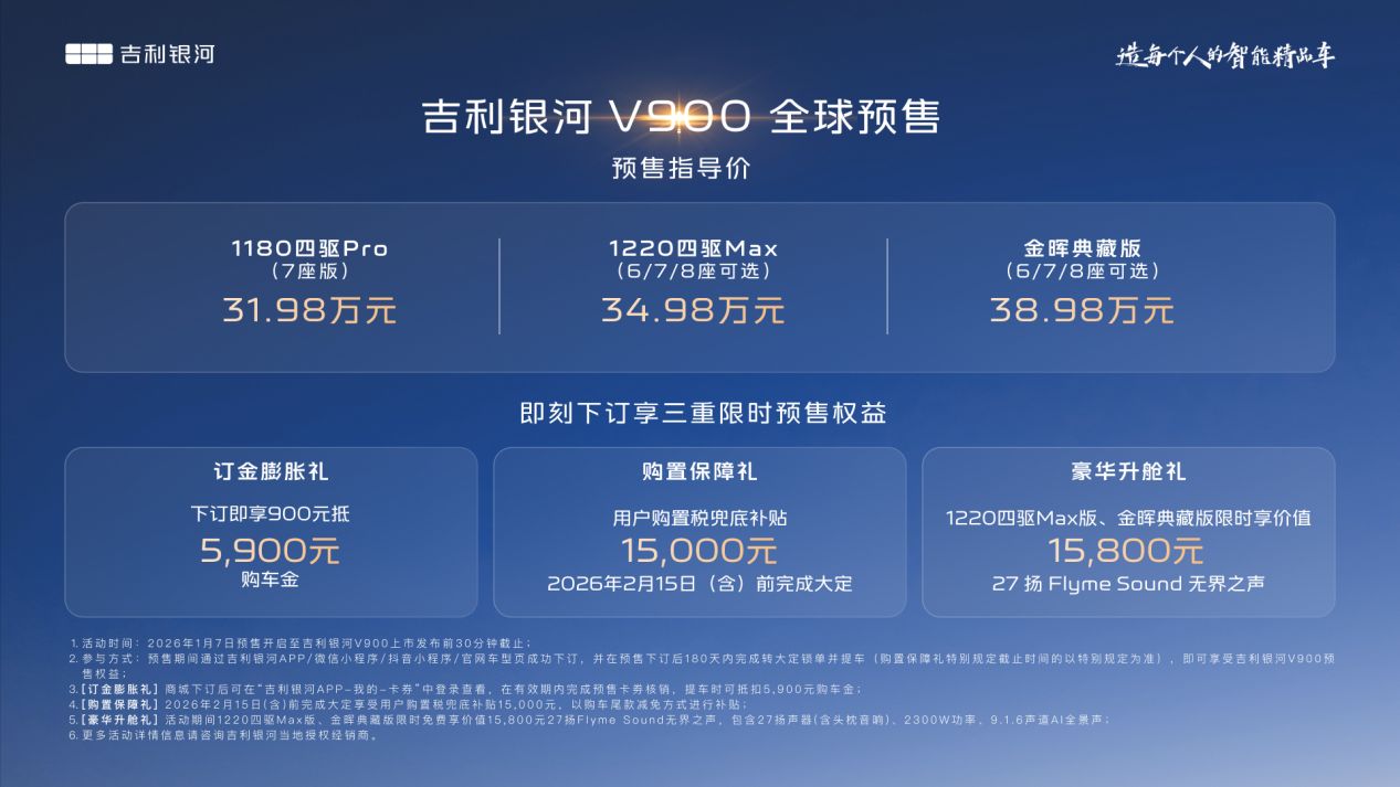 1月7日,吉利银河旗下V系列的首发之作,“AI全场景家庭旗舰MPV”——吉利银河V900正式开启预售,共计3个版本,预售指导价格区间为31.98万元~38.98万元。新车围绕中国大家庭出行的真实需求,以宽奢空间、豪华驾控、全维安全、AI智能几大全能满配实力,重新定义豪华旗舰MPV价值标准,树立AI全场景豪华出行新高度。