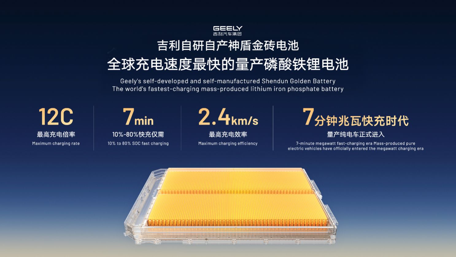 据了解,i-HEV智能双擎融合了全球最好的动力系统和全球领先的三电技术,是一款足以超越“日系混动”的全球新一代油电混动产品。作为全球首个应用“AI云动力”的油电混动系统,i-HEV智能双擎可将HEV的百公里油耗降低至3L,配合吉利自研的智能电驱,整车功率将比主流HEV提升至少20%,并让燃油车也拥有十足电感。 此前,吉利与雷诺集团成立了全球最大的动力公司HORSE。目前,HORSE已为15个全球主流、高端以及豪华汽车品牌,每年提供超过800万台套发动机、变速器、混合动力系统等产品,也让吉利拥有了全球最领先的动力技术。 全固态电池将装车验证,Robotaxi年内迎来试运营 在动力电池领域,吉利神盾金砖电池最高充电倍率可达12C,是目前全球充电速度最快的量产磷酸铁锂电池,10%~80%电量补能最快仅需7分钟,推动量产纯电车进入“7分钟兆瓦快充时代”。