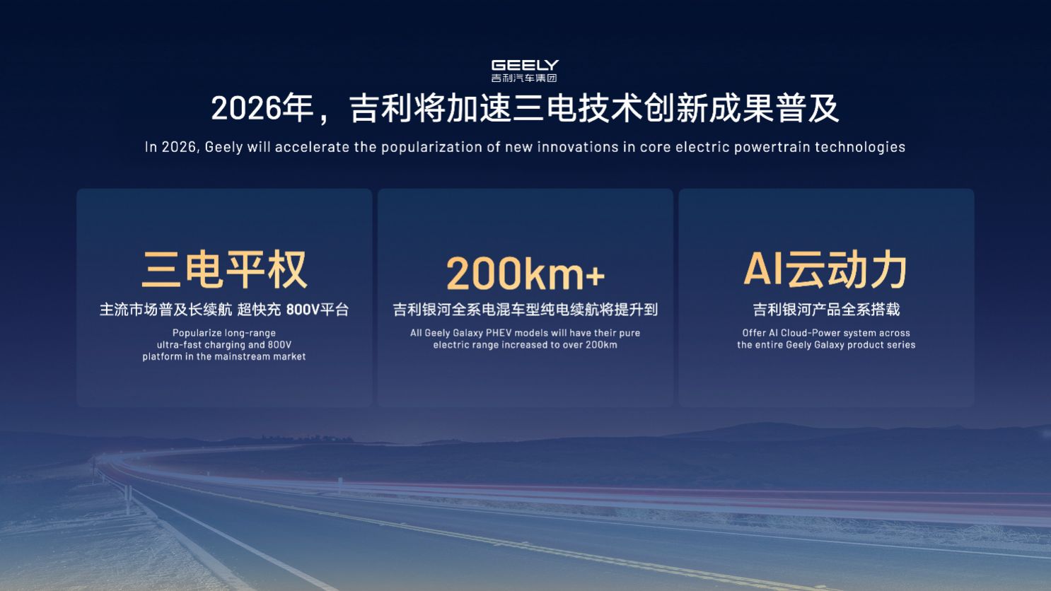 今年,吉利将完成全固态电池的首个Pack下线和装车验证,并将把长续航、超快充、800V平台带入主流市场,吉利银河全系电混车型的纯电续航也将提升到200km以上,而且全部搭载AI云动力。未来,吉利神盾金砖电池还将推出全新磷酸锰铁锂材料体系,将电池的能量密度进一步提升15%以上。