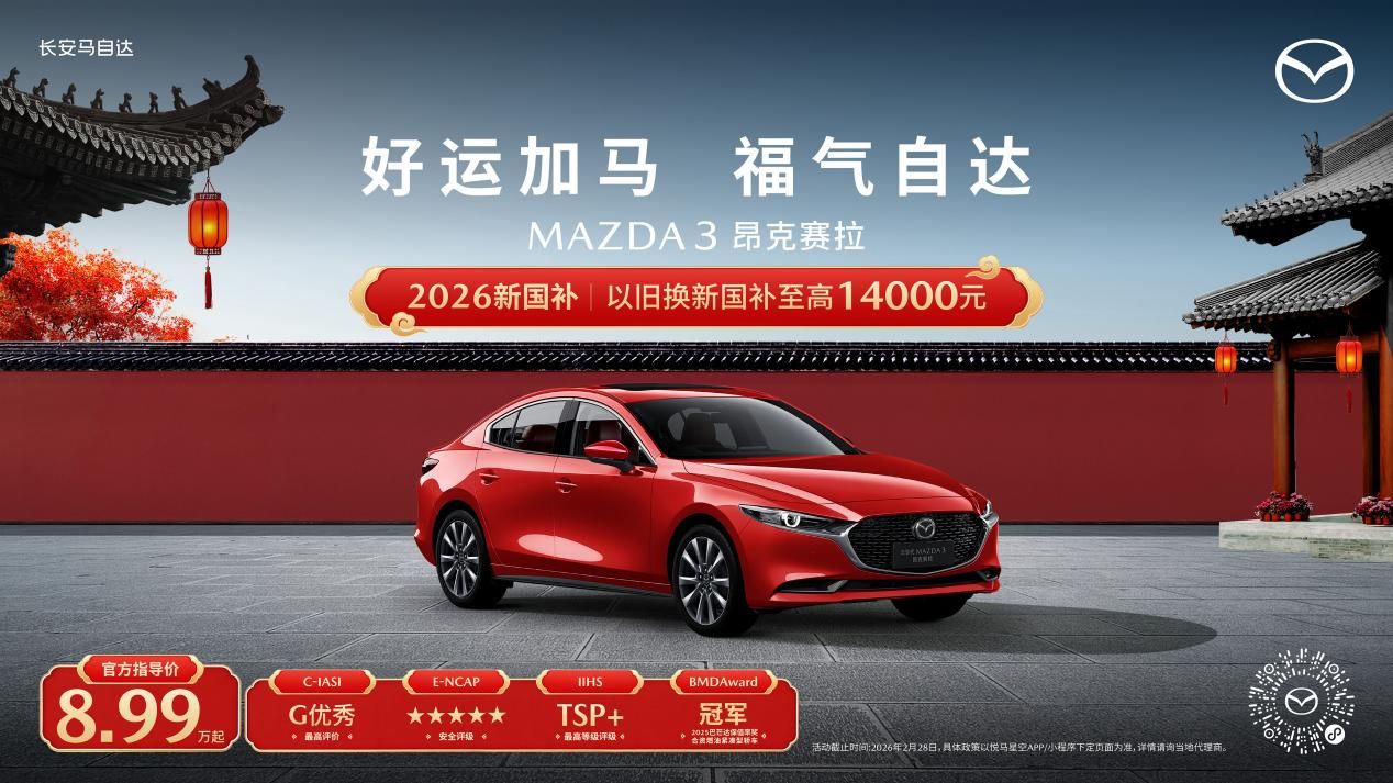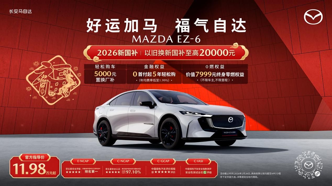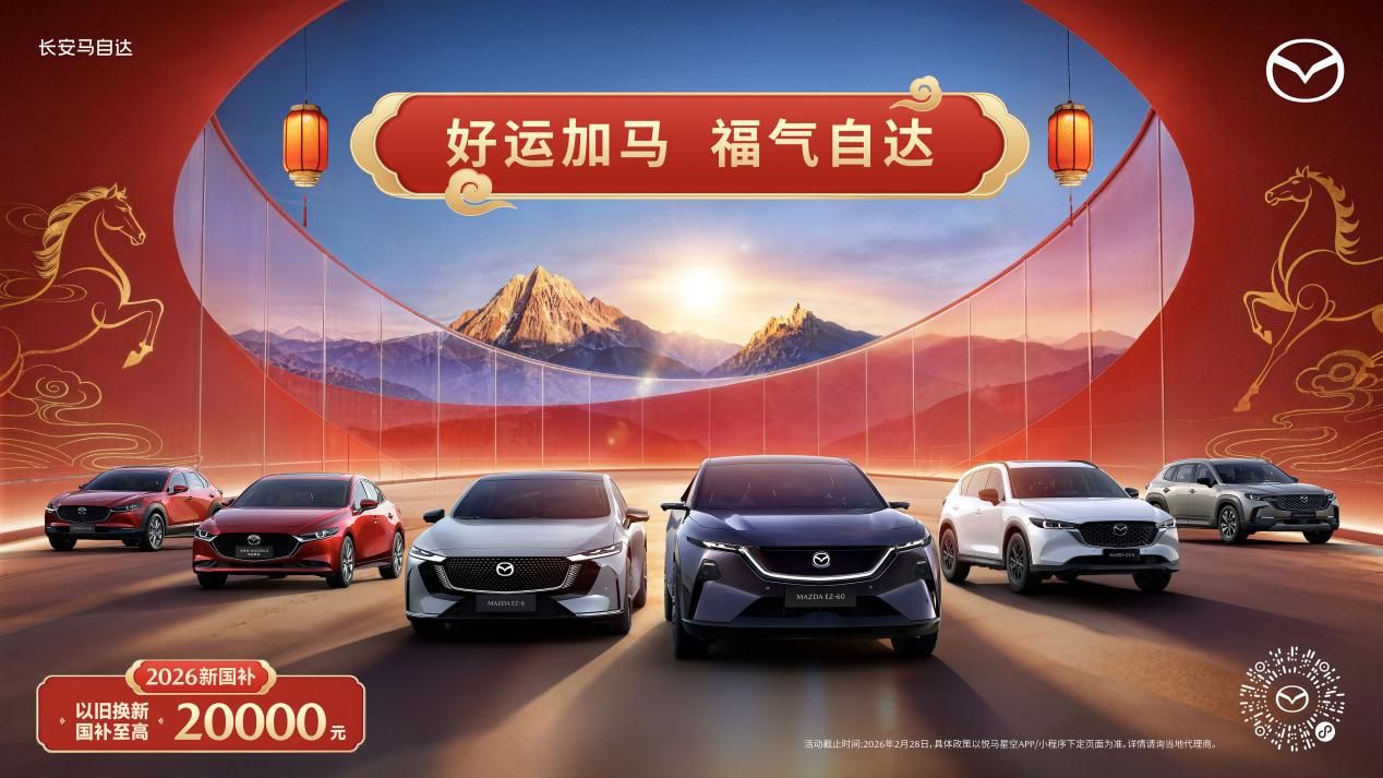 好运加马,福气自达!值此新春佳节阖家团圆之际,长安马自达向全国用户致以最诚挚的祝福。即日起至2026年2月28日,品牌全系车型重磅推出新春购车盛宴——MAZDA EZ-60运动版热血上新,购车可享5,000元国补叠加补贴和3,000元选配基金等多重专属好礼;MAZDA EZ-6 购车0首付起,另享至高20,000元新国补;MAZDA CX-50行也焕新一口价13.98万元起,MAZDA3昂克赛拉全系8.99万起,MAZDA CX-5全系限时11.58万起,MAZDA CX-30全系9.99万起。每一款车型都是全球顶级安全与品质之选,让“人马一体”驾趣体验触手可及。