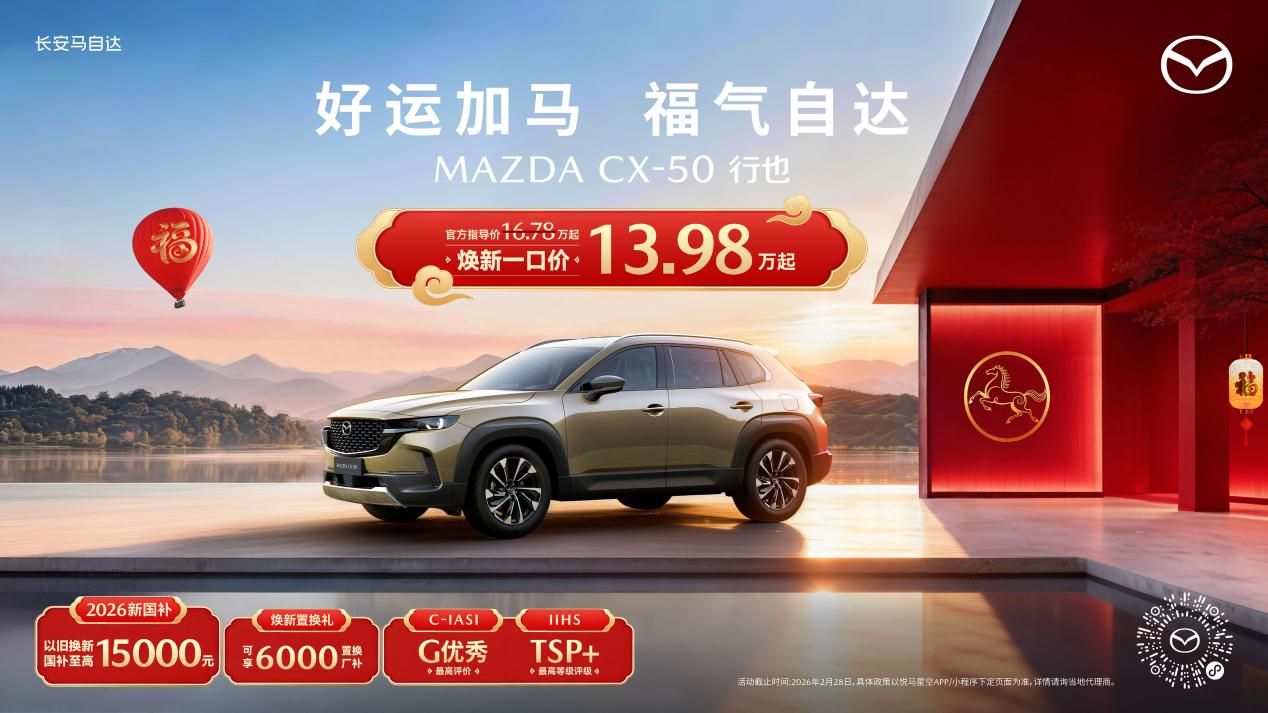 作为长安马自达全球化战略核心车型,EZ-6登陆全球市场以来,已在波兰权威年度汽车评选“最佳汽车2025”中,一举斩获“年度家庭车”与“设计大奖”双项荣誉,目前正稳步推进澳洲、东南亚等海外市场布局,设计美学与产品实力获得全球媒体及用户的广泛认可。安全方面,EZ-6相继拿下TOP Safety顶级安全认证、C-NCAP五星评级、E-NCAP五星认证、中保研10项G优秀评价、第19届国际汽车交通安全学术会议“安全典范奖”五大权威奖项,真正实现设计、安全与品质的全球标准。 CX-50行也全系13.98万起,山系宽体SUV解锁多元生活 活动期间,CX-50行也焕新一口价13.98万元起,叠加6,000元置换厂补与至高15,000元以旧换新国补,质价比再攀新高。以“山系生活宽体SUV”为精准定位,CX-50行也凭借宽体车身带来的越级空间、全路况通过性,以及与户外生活场景的高度适配性,完美契合当代家庭“城市通勤+户外旅行”的多元出行需求,成为新春阖家出行的理想伴侣。安全保障上,CX-50实力堪称同级标杆——全球范围内上市以来,连续多年荣膺北美IIHS TSP+顶级安全之选,同时在C-IASI中保研测试中斩获6项全优成绩。高强钢车身搭配全域主动安全系统,从硬件到软件全方位筑牢安全防线,让每一次家庭出行都安心无忧。