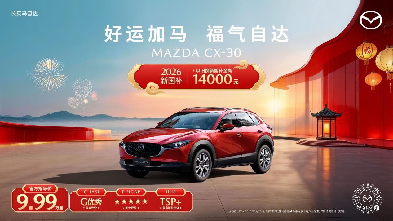 [MAZDA CX-30全系9.99万起] 即日起,消费者可前往长安马自达全国授权经销商门店,或通过“悦马星空”APP/小程序查询政策详情、预约试驾及预订新车。长安马自达将以匠心品质、贴心服务与重磅福利,陪伴广大用户共度温暖团圆年,携手开启美好出行新旅程。
